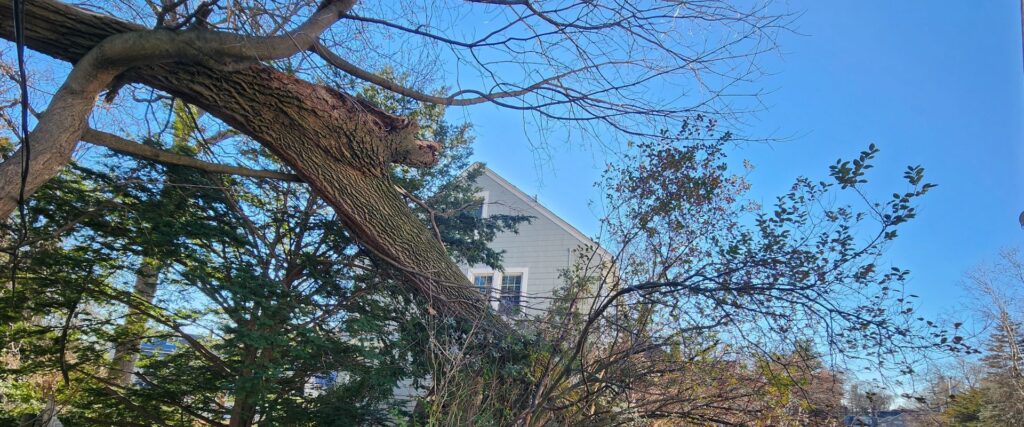 Mature maples and oaks common across Northern NJ often develop co-dominant stems – two trunks growing from the same point. While they look sturdy, the bark between them forms a seam that splits easily under snow and ice. Homeowners rarely notice this until failure occurs. Arborists know how to spot these stress points and recommend cabling or pruning before winter loading.